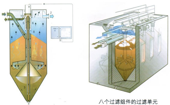 活性砂过滤器采用逆流原理。待处理的水从设备底部的入流分配管(1)流入,向上流经滤床而被过滤,然后向顶部的滤液出流口(2)流出。含有待处理杂质的 滤砂从设备锥形底部(3)被空气提升泵(4)提升到顶部的滤砂清洗器(5)。滤砂的清洗在提升泵中就已经开始,在紊流混合作用下杂质从砂粒中分离出来,脏 砂从泵的出口溢出并进入清洗器曲径通道(6),在那里砂被小流量的清水逆流冲洗干净,杂质通过洗砂水出口(7)排出,而清洗后的砂粒(较重)又返回砂床 (8)。结果是砂床在设备中不断的做缓慢下沉运动。提升泵用压缩空气通过空气分配器提供(9).水的净化与砂的清洗同时进行,因而过滤器可以不受干扰地连 续进行。